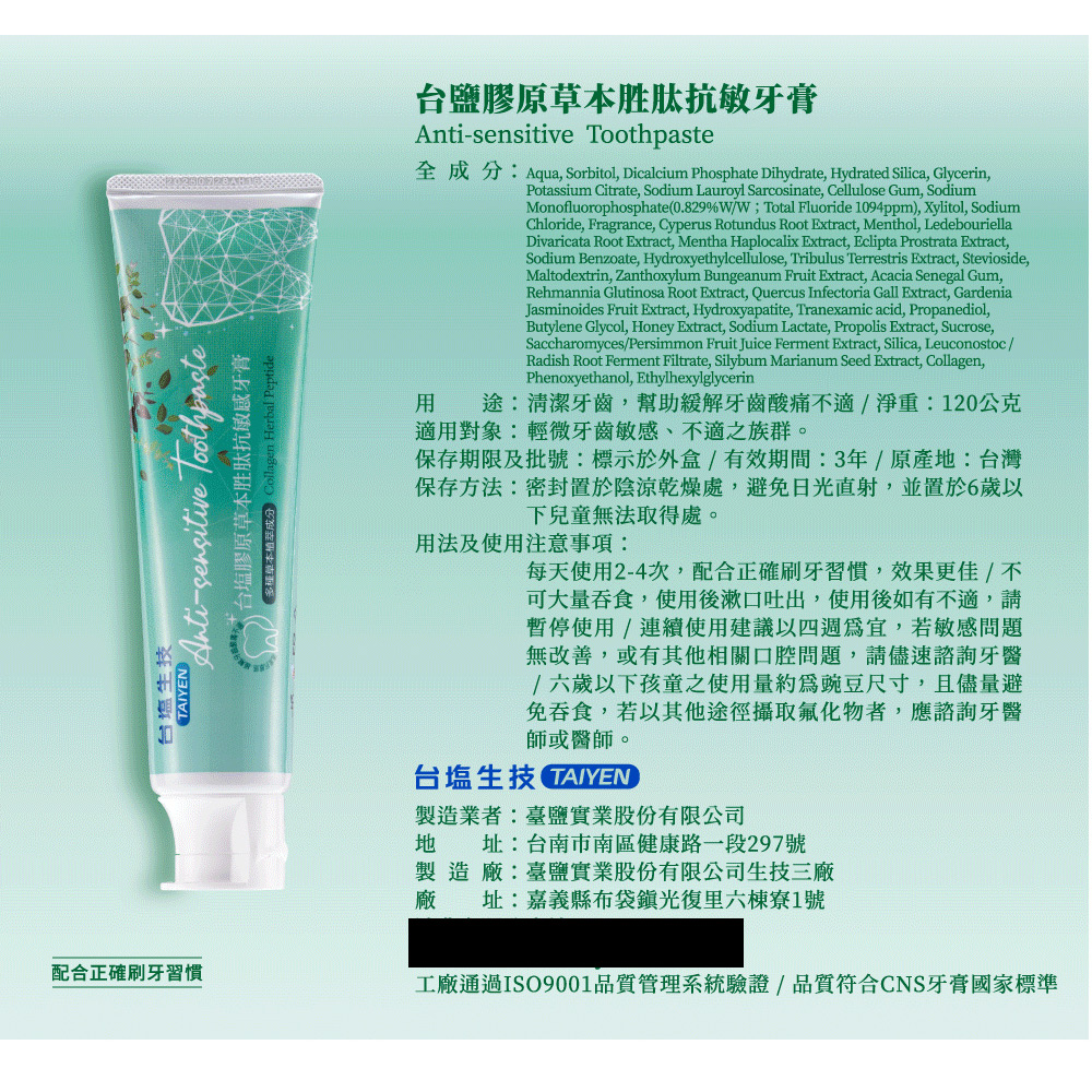 主商品:台鹽膠原草本胜肽抗敏感牙膏(120g)(一次購買2條以上者,附贈3D按摩健康牙刷一支)