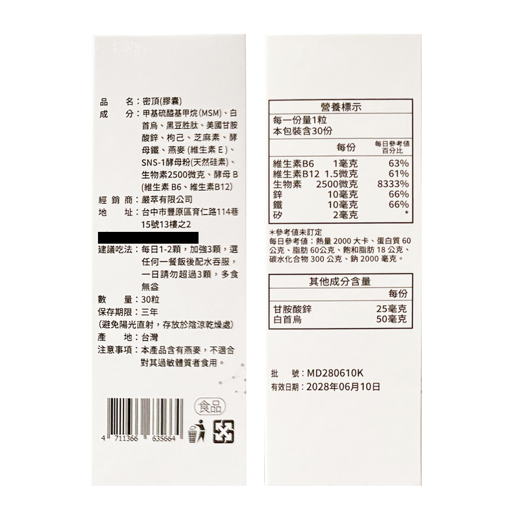 【內容成分】::甲基硫醯基甲烷(MSM)、白首烏、黑豆胜肽、美國甘胺酸鋅、枸己、芝麻素、酵母鐵、燕麥(維生素 E)、SNS-1酵母粉(天然硅素) 、生物素 2500 微克 、酵母 B(維生素 B6,維生素 B12)。