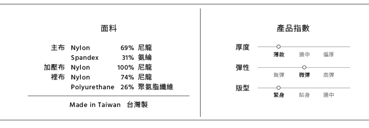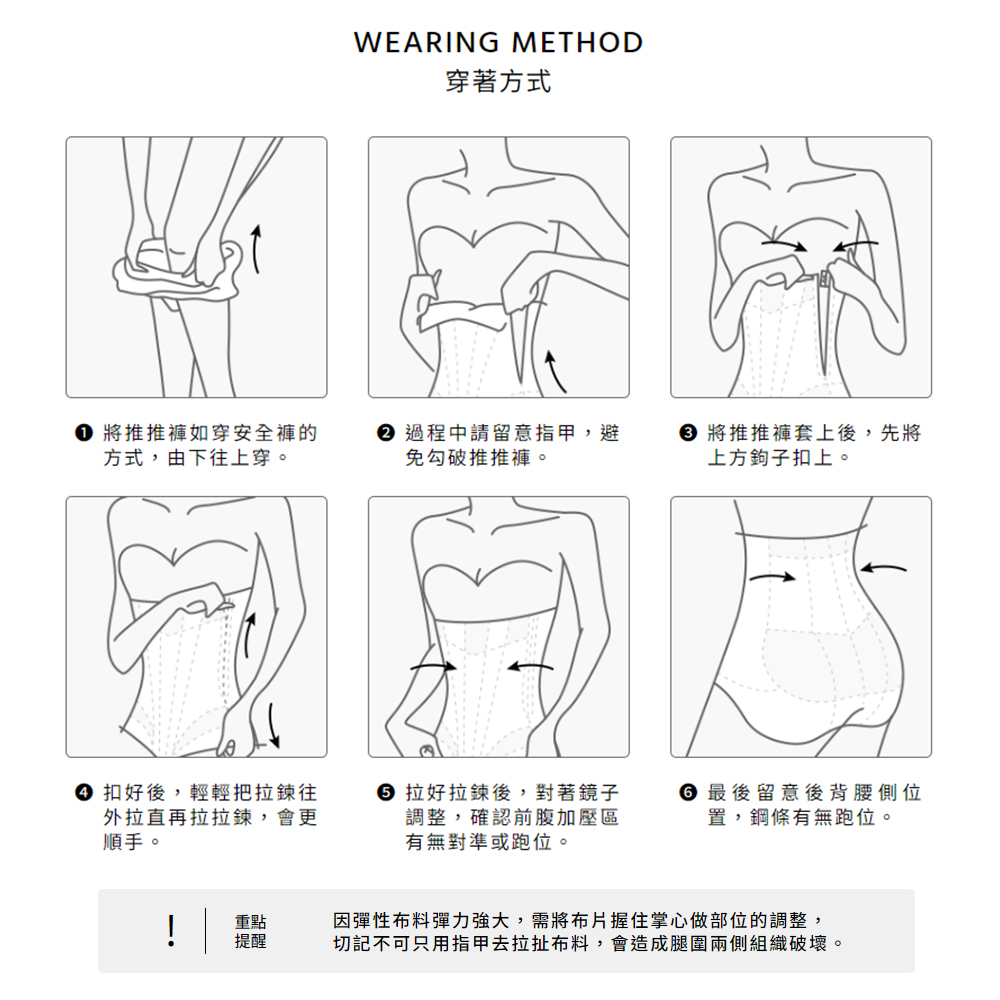 《使用教學》● 穿著過程中請留意指甲,避免勾破布料;穿至腰部後,先扣上鉤扣再拉拉鍊會更順手;穿好後請對鏡確認:前腹加壓區與後腰鋼條位置是否正確不跑位。