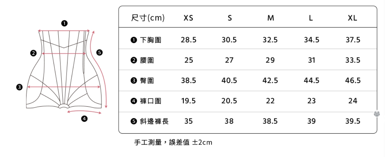 ● 尺寸表以「能流暢拉鍊、舒適穿一整天」為基準設計,新手可安心參考;若身材範圍在2尺寸間,喜歡緊實感可選較小號,重視舒適或首次穿著者建議選擇較大號。