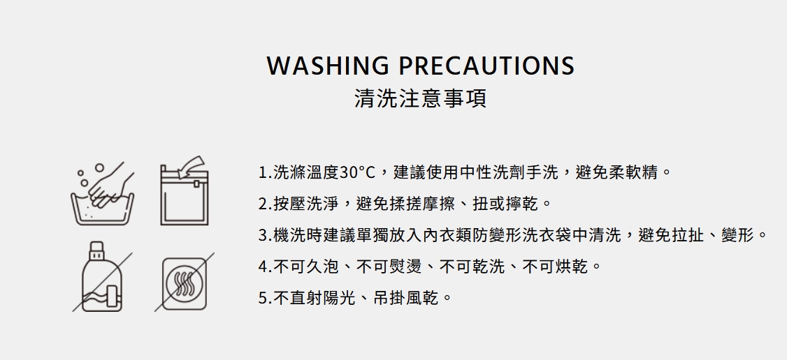 ● 洗滌時建議使用中性洗劑手洗(微浸泡,不能搓),或裝入防變形洗衣袋機洗,不要烘、熨燙或使用柔軟劑。